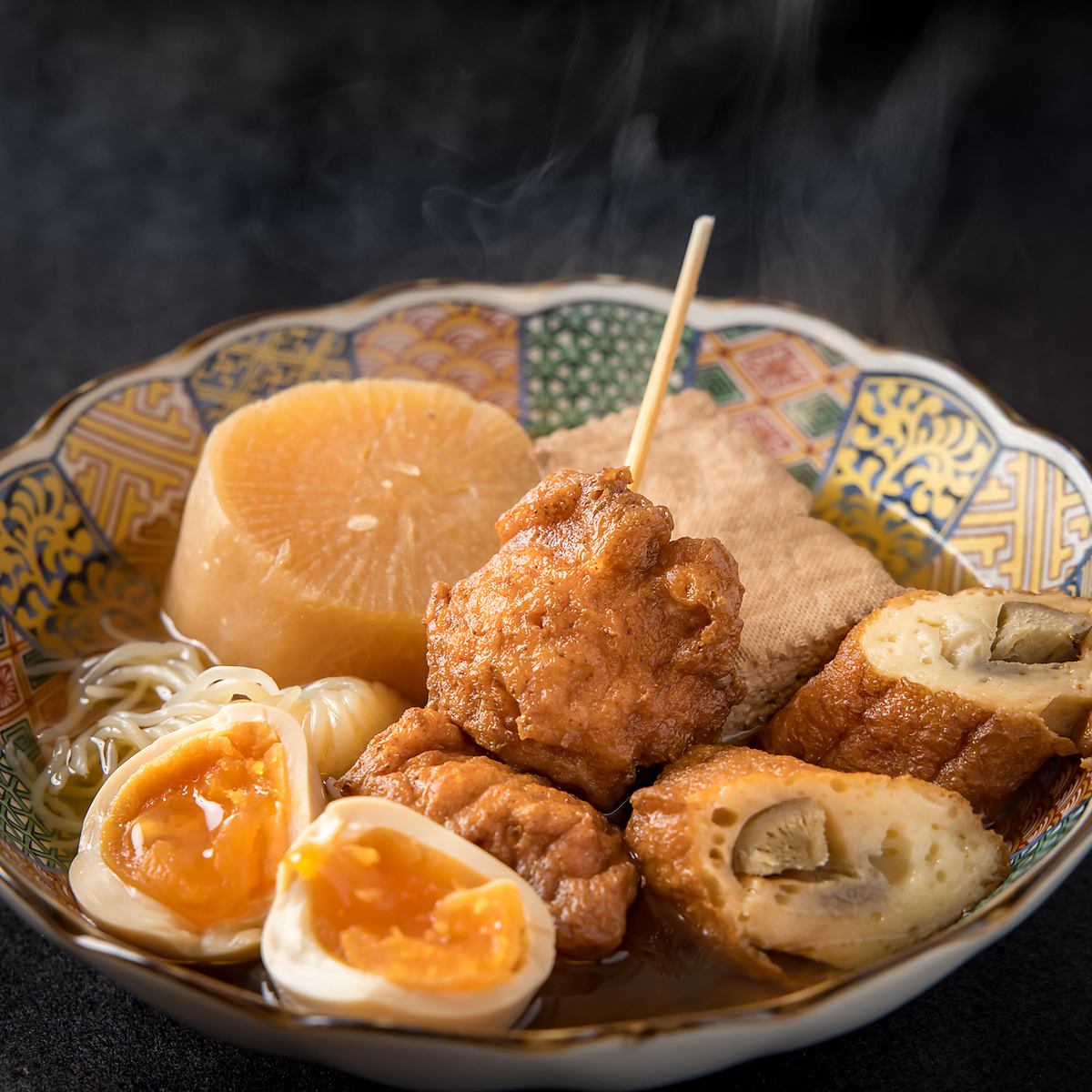 大阪の魅力が詰まった自家製のおでんをご堪能ください!香り高いお出汁にじっくりと浸かったねりもんたちは、海の幸がたっぷり詰まった贅沢な盛り合わせ◎種類豊富なねりもんは、素材へのこだわりと丁寧な仕込みから生まれるやさしい味わいが特徴です。一口食べれば心も体も温まり、ほっこりとした気持ちにさせてくれます◎
